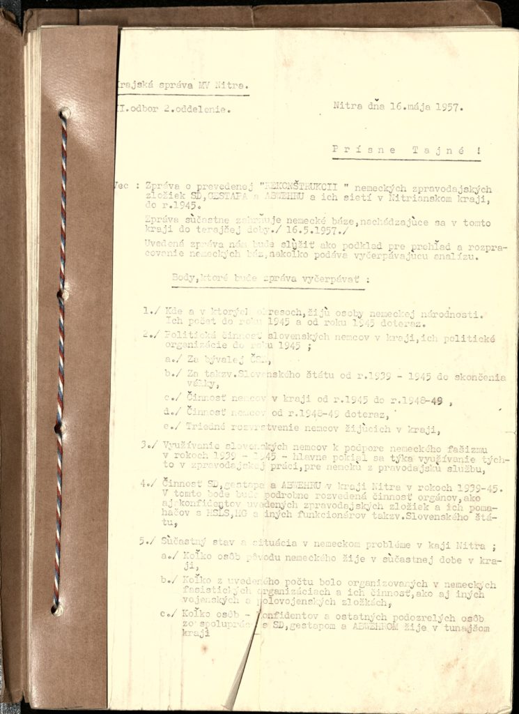 Na ilustráciu si môžete pozrieť prvú stranu dokumentu, ktorý Ústav pamäti národa anonymne dostal v decembri 2022. Dokument vytvoril útvar ŠtB na vtedajšej Krajskej správe ministerstva vnútra Nitra.