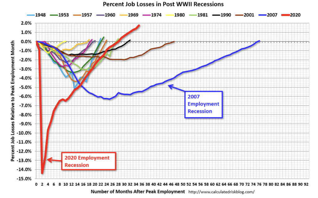 Počet pracovných miest v Spojených štátoch je takmer o 2 percentá vyšší, než bol na poslednom vrchole. V porovnaní s predchádzajúcimi povojnovými recesiami vidieť, aký masívny efekt na ekonomiku mal gigantický fiškálny a monetárny stimul.