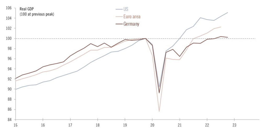 Kým americký reálny hrubý domáci produkt je 5 percent nad úrovňou spred pandémie, ten nemecký je ešte len na úrovni spred pandémie.