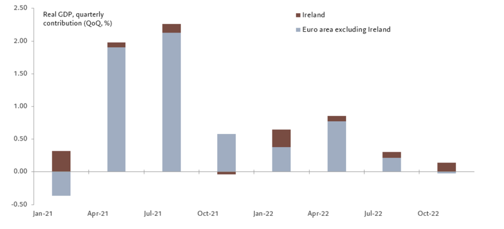 Čísla za celú eurozónu skresľuje vývoj v Írsku. To je vzhľadom na jeho špeciálne postavenie daňového raja a z toho vyplývajúceho dynamického rastu HDP skutočne jedinečné – medziročné tempo v štvrtom štvrťroku 2022 dosiahlo 14 percent.