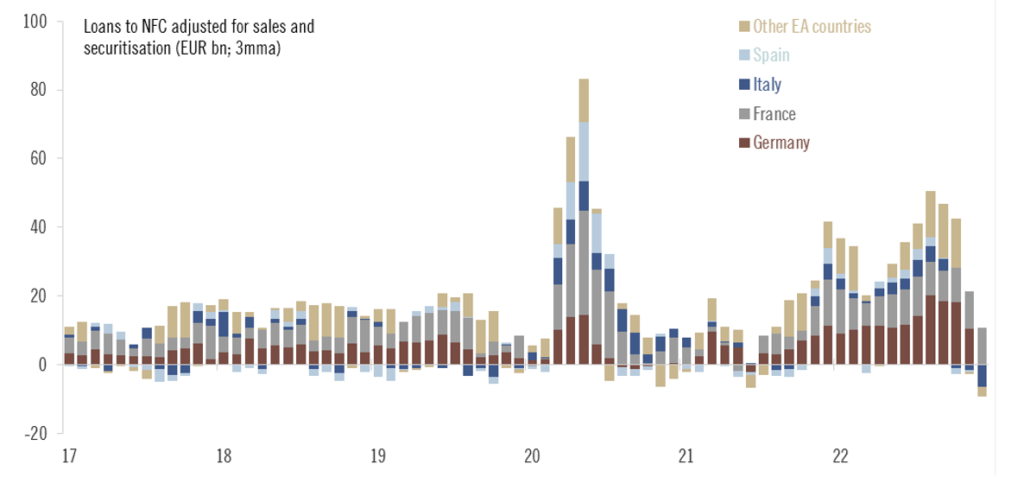 Spomaľovanie vidieť aj na úverovaní. V decembri klesol objem bankových úverov podnikom naprieč celou eurozónou s výnimkou Francúzska. Prepad úverovania v Nemecku bol najväčší od zberu týchto dát.