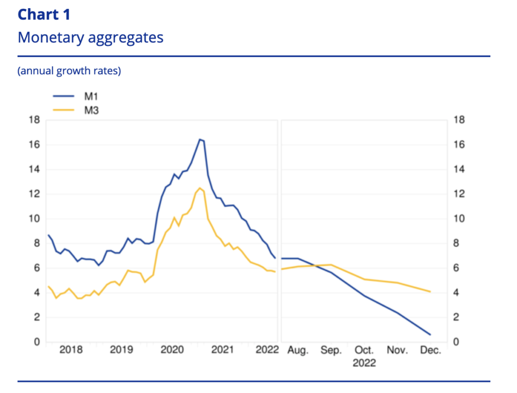 Medziročné tempo rastu peňažnej zásoby (agregát M1 = obeživo a vklady splatné na požiadanie) v eurozóne sa spomalilo z 2,4 percenta v novembri na 0,6 percenta v decembri 2022.