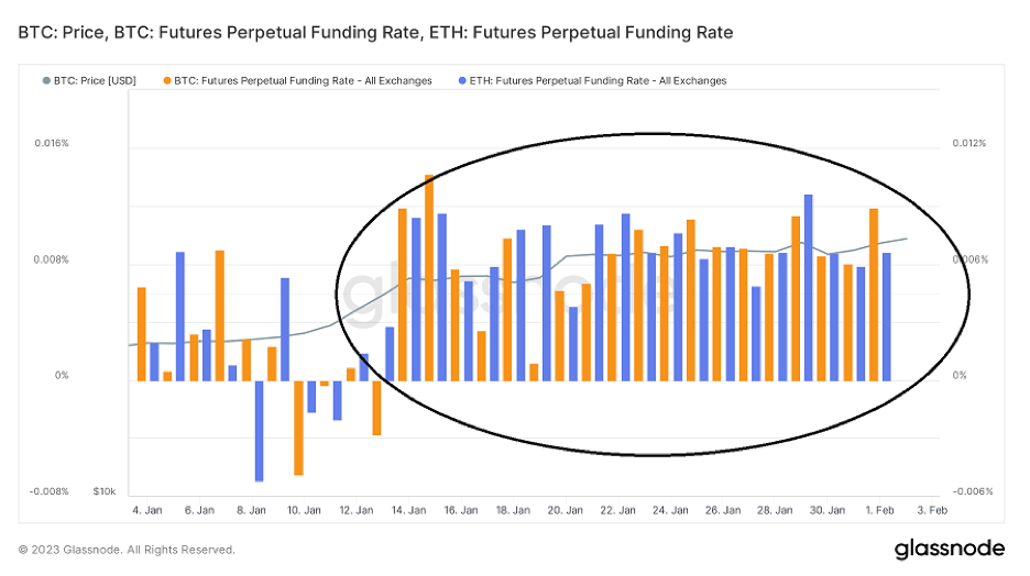 Eufória narastá, keďže hlavné kryptomeny od 14. januára naďalej požadujú pozitívne financovanie. Keď je miera financovania perpetuálnych futuritných kontraktov kladná, dlhé pozície pravidelne vyplácajú krátke pozície. Údaje na reťazci ukazujú, že ide o najdlhší úsek pozitívneho financovania od novembra, pričom existujú náznaky rely poháňanej spotovým trhom, keďže Long/Short pozícia futuritných kontraktov zostáva neutrálna (1,09).