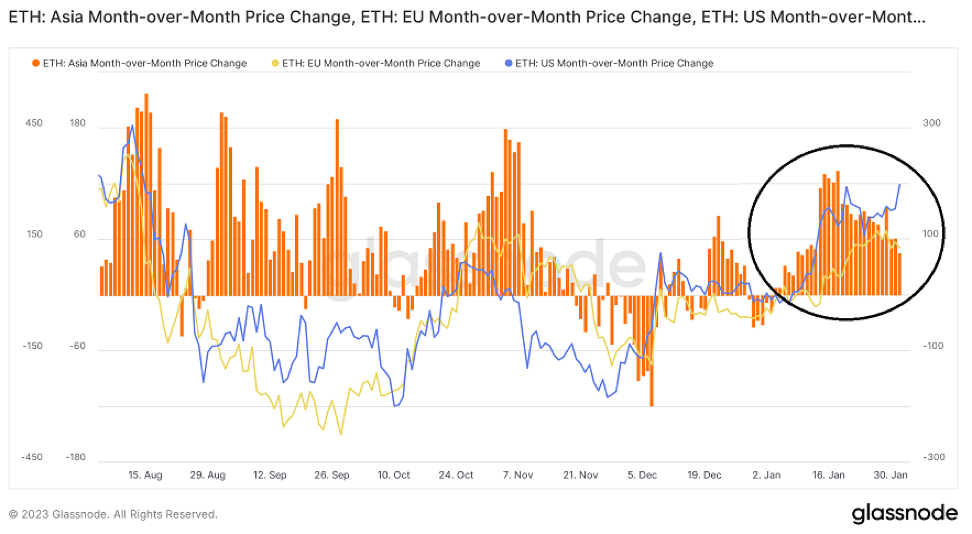 Súbeh spotových nákupov v troch regiónoch je zriedkavým javom, ktorý slúži ako hlavný ukazovateľ stability cien a potenciálneho pohybu smerom nahor. Vzhľadom na význam ázijského regiónu údaje na reťazci ukazujú, že cena je oveľa citlivejšia na zmeny v nálade investorov v Ázii. Ázijský región akumuluje od novembrového výbuchu FTX, pričom USA a EÚ ho nasledujú. Súbeh spotových nákupov naprieč regiónmi ako taký signalizuje aj vyčerpanie predajcov.