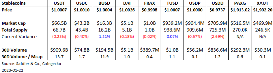 Stablecoiny založené na americkom dolári existujú v objeme takmer 140 miliárd dolárov. Tvoria viac ako 99 percent trhu so stablecoinmi. Existujú aj stablecoiny založené na EUR, CHF, GBP, MXN, AUD, JPY, HKD, CAD, ale v obehu je ich objem menej ako pol miliardy dolárov. Stablecoiny naviazané na zlato sú rozšírenejšie ako zahraničné meny, pričom v obehu sú v objeme približne 1 miliardy dolárov. Preto sa v rámci financovania zaujímame predovšetkým o stablecoiny založené na americkom dolári.