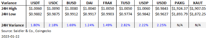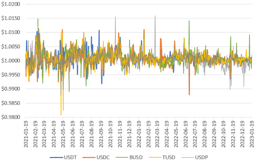 Hoci sú stablecoiny navrhnuté tak, aby presne kopírovali svoje podkladové aktívum, prirodzené sily ponuky a dopytu spôsobujú, že sa ich kurz počas dňa výrazne mení. Je to zvyčajne dôsledok toho, že sú k dispozícii na rôznych blockchainoch a burzách, a rizikových faktorov spojených s každým tokenom. Môžu byť tiež predmetom manipulácie zo strany veľkých účastníkov trhu. V bežný deň sa priemerná variancia naprieč obchodnými pármi so stablecoinom pohybuje od 1 do 3 percent. Počas období neistoty a extrémnej volatility môže priemerná variancia presiahnuť 4 percentá. Do polnoci podľa koordinovaného svetového času (UTC) – času "zatvorenia" trhu s kryptomenami – sa však priemerná variancia približuje a zvyčajne sa pohybuje v rozmedzí 1 percenta od hodnoty viazanej meny.