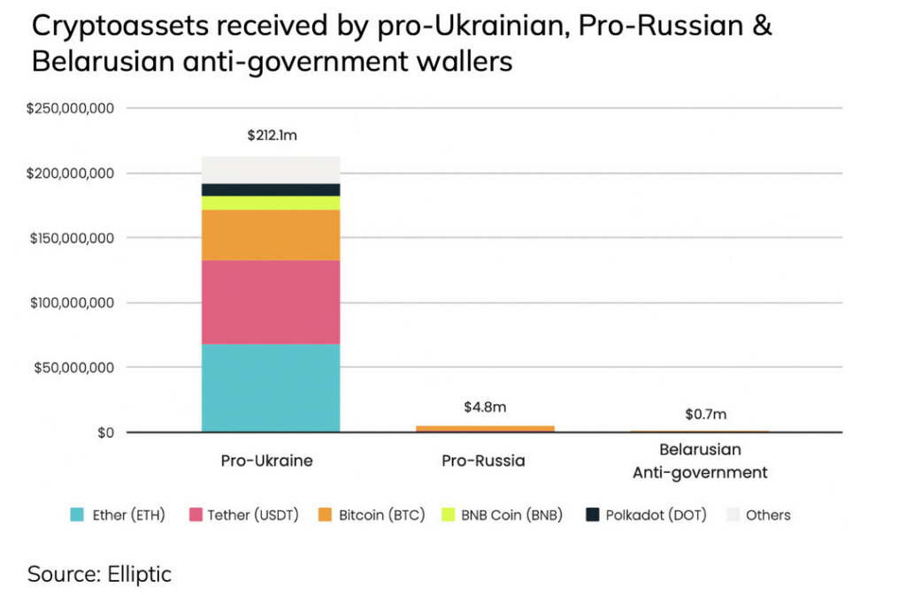 Spoločnosť Elliptic zistila analýzou blockchainových transakcií v hodnote viac ako 230 miliónov dolárov, že proukrajinské kampane na získavanie finančných prostriedkov boli výrazne úspešnejšie (212,1 milióna dolárov) ako proruské peňaženky (4,8 milióna dolárov). A to napriek tomu, že Rusko je pod medzinárodnými finančnými sankciami.