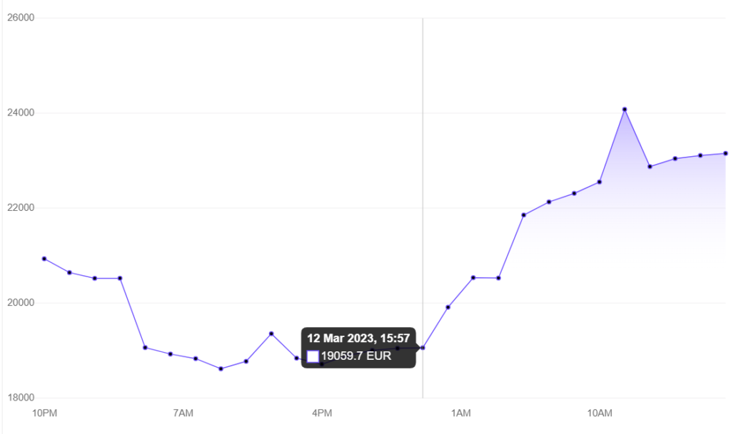 Bitcoin od krachu SVB minulý piatok posilnil približne o tridsať percent a dostal sa na 9-mesačné maximum. Jeho cena vzrástla z približne 19-tisíc až na 24-tisíc eur a aktuálne sa pohybuje zľahka nad 23-tisíc eur.