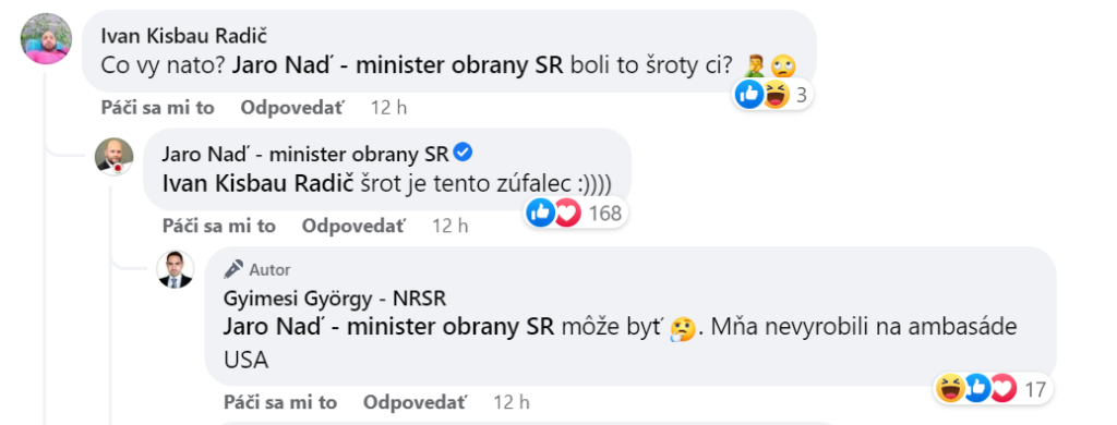 V komentároch pod príspevkom označili aj ministra obrany Jaroslava Naďa, ktorý darovanie stíhačiek podporoval a odmietol zverejniť právnu analýzu, ktorá má dokazovať ústavnosť tohto rozhodnutia.