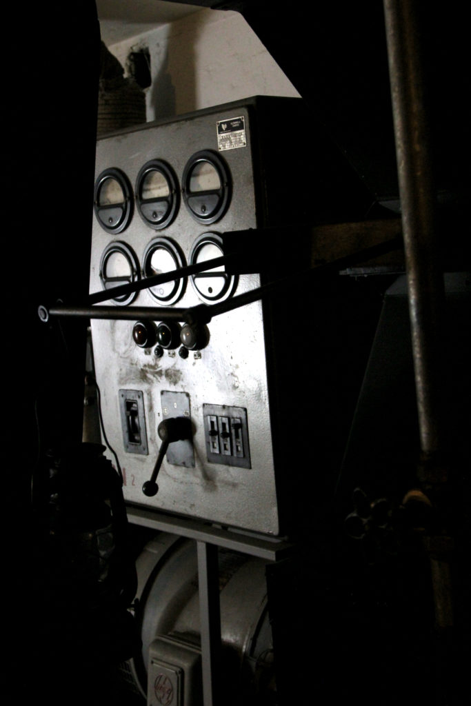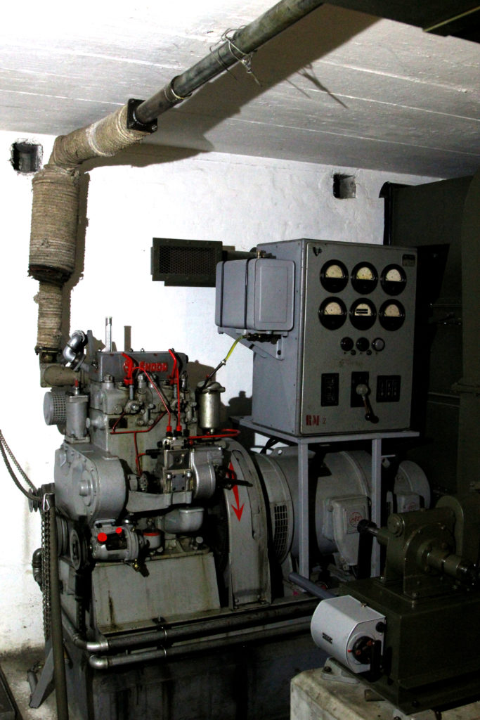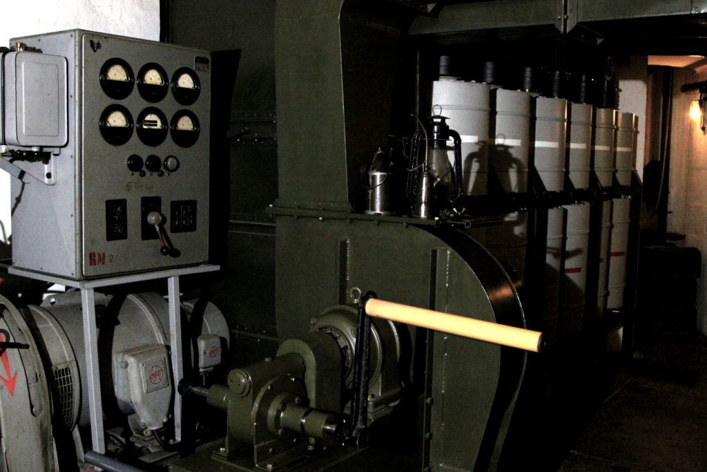 Za týmito dverami sa už ocitnete v technickej miestnosti – strojovni a filtrovni. Strojovňa obsahovala motor s generátorom značky Škoda na výrobu elektrickej energie, ktorá bola potrebná na pohon ventilácie.
