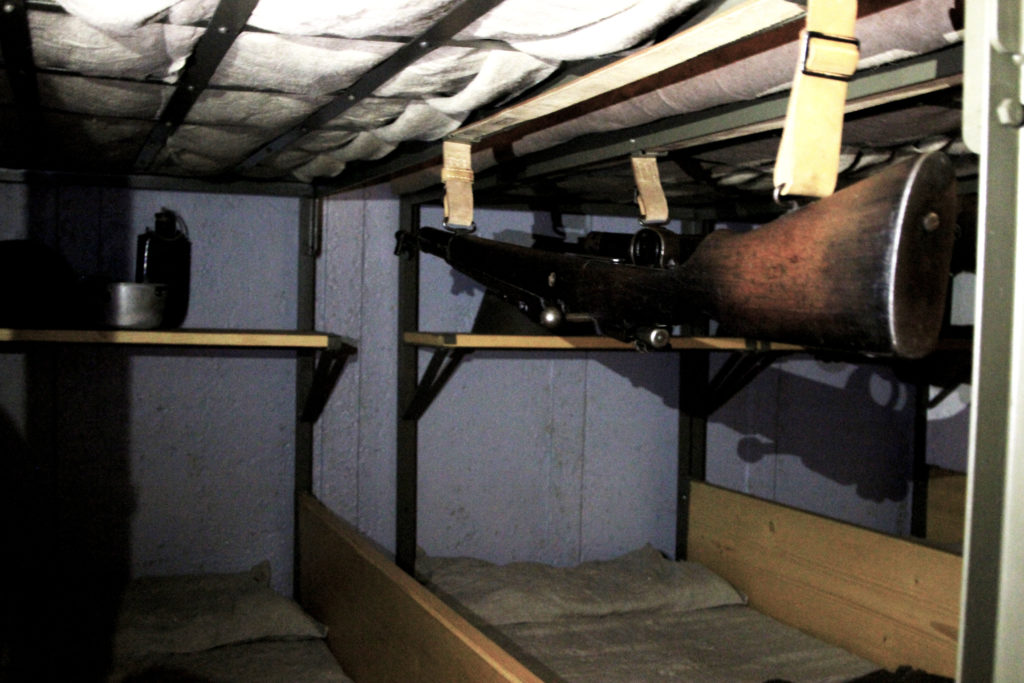 V podzemí je aj ubikácia pre poddôstojníkov. Štyria mali k dispozícii dve postele. Na vrchnej bola prehodená uniforma. Na nej výložka, ktorá charakterizovala vojakov v opevnení. Purpurová výložka bola farbou pechoty a odznak so psom znamenal, že to boli hraničiari. Títo poddôstojníci mali väčšiu zodpovednosť – boli to velitelia streleckých miestností alebo pozorovatelia v spomínaných pozorovacích zvonoch.