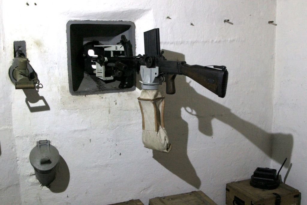 Zo streleckej miestnosti prechádzame do ľavého krídla objektu. Nachádza sa tam ľahký guľomet, ktorý slúžil ako pomocná zbraň na obranu hlavných zbraní alebo bezprostrednú obranu objektu. Pri ňom je periskop na pozorovanie mŕtvych uhlov. Človek sa tak pozerá dole do ochrannej priekopy, ktorá je pred hlavnými zbraňami. A tie bolo potrebné chrániť. Ak by do priekopy skočil nepriateľský vojak, obrancovia by mu poslali granát. Pri guľomete je totiž klapka a za ňou rúra smerujúca do priekopy – takzvaný granátový sklz.
