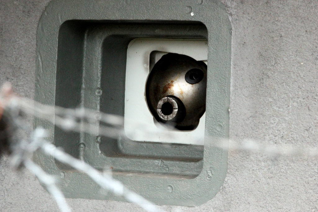 Smerujeme do podzemia, pod úroveň terénu. Cez otvor v podlahe vedú doň železné stúpačky zapustené v betóne.