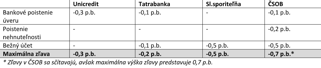 Aktuálna úroková sadzba, ktorú banky poskytujú, sa dá podľa analytika znížiť aj vďaka kombinácii viacerých bankových produktov. Niektoré peňažné ústavy na Slovensku totiž poskytujú za využívanie ďalších produktov okrem hypotéky zľavu z úrokovej sadzby. Ide o produkty ako bankové poistenie úveru, poistenie nehnuteľnosti či založenie bežného účtu v danej banke.