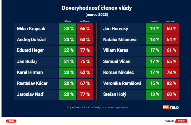 Najvyššou nedôverou podľa prieskumu oplýva ministerka investícií, regionálneho rozvoja a informatizácie Veronika Remišová, ktorej nedôveruje 82 percent respondentov a dôveruje 15 percent. V rebríčku nedôvery nasleduje minister vnútra Roman Mikulec, ktorému nedôveruje 78 percent respondentov a dôveruje 17 percent.