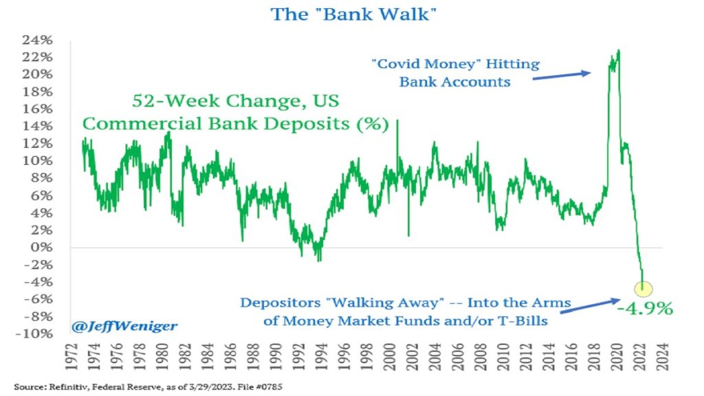 Ďalšou otázkou je, kam vklady mizli. Pravdepodobnou odpoveďou je, že do fondov peňažného trhu a do štátnych a podnikových dlhopisov. Tieto aktíva v prostredí rastúcich úrokových sadzieb ponúkali vyššie zhodnotenie než bankové vklady.