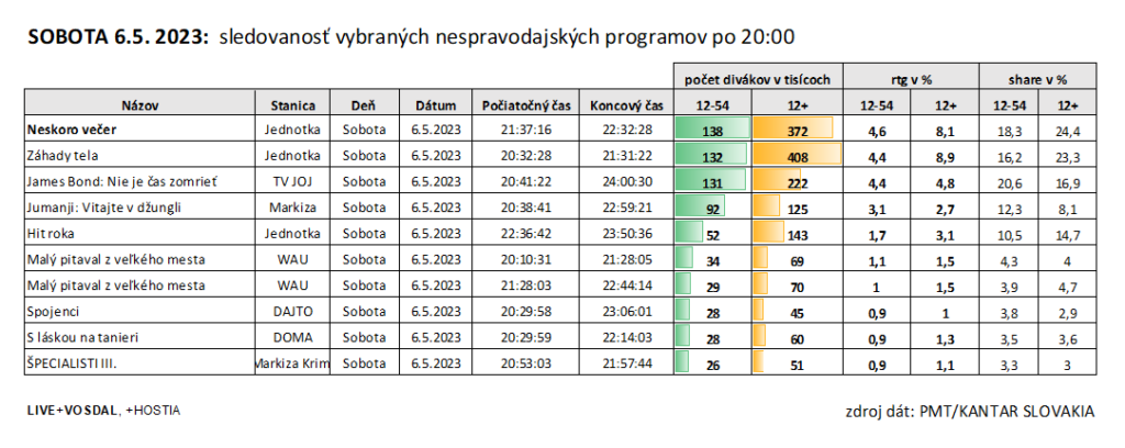 Najsledovanejším programom sobotného večera sa stal tandem zábavných relácií na Jednotke: Záhady tela a Neskoro večer. Kým tolkšou Neskoro večer dominovala v komerčnej cieľovke 12-54 (138-tisíc divákov), v univerzálnej CS 12+ zasa patrilo víťazstvo relácii Záhady tela (408-tisíc divákov).