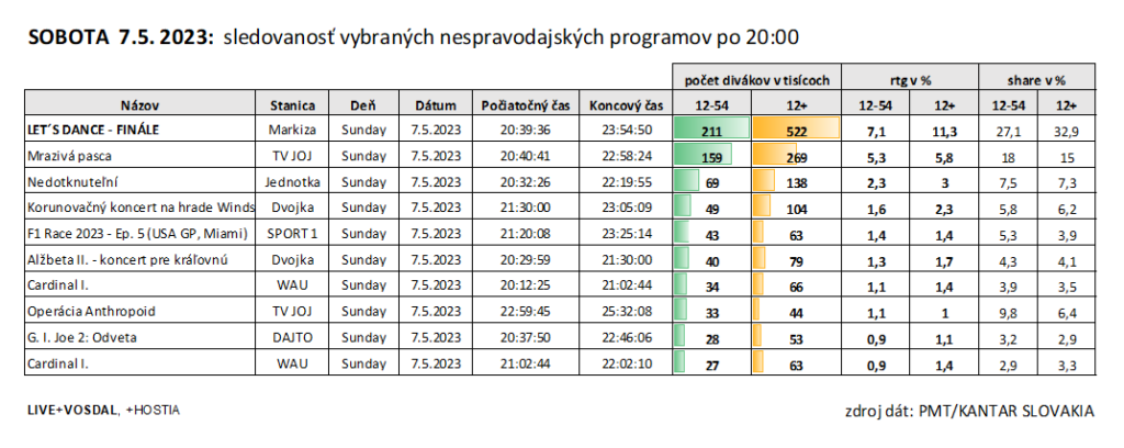 V univerzálnej cieľovke si finále Let's Dance pozrelo 522-tisíc divákov. Konkurenčnú premiéru akčného thrilleru Mrazivá pasca s Liamom Neesonom sledovalo v univerzálnej cieľovke 269-tisíc divákov.