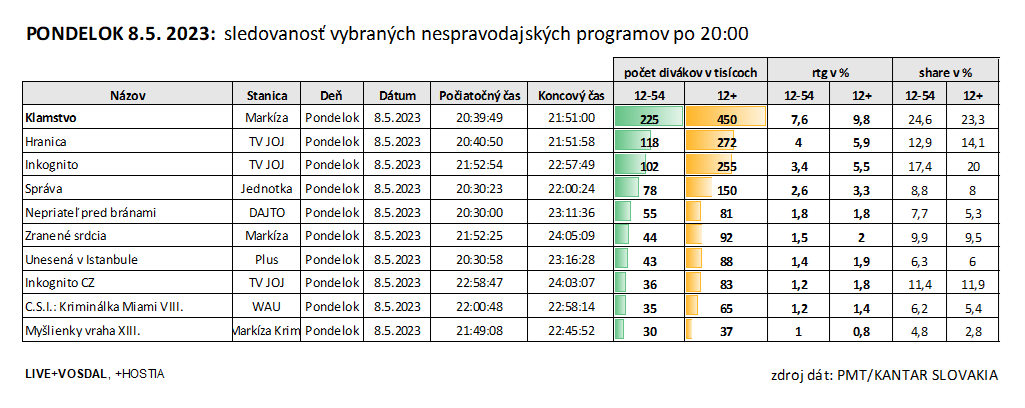 Tretia priečka patrila v oboch cieľovkách televíznej premiére poslednej bondovky s Danielom Craigom. Film James Bond: Nie je čas zomrieť sledovalo v komerčnej cieľovke 131-tisíc a v CS 12+ 222-tisíc divákov.