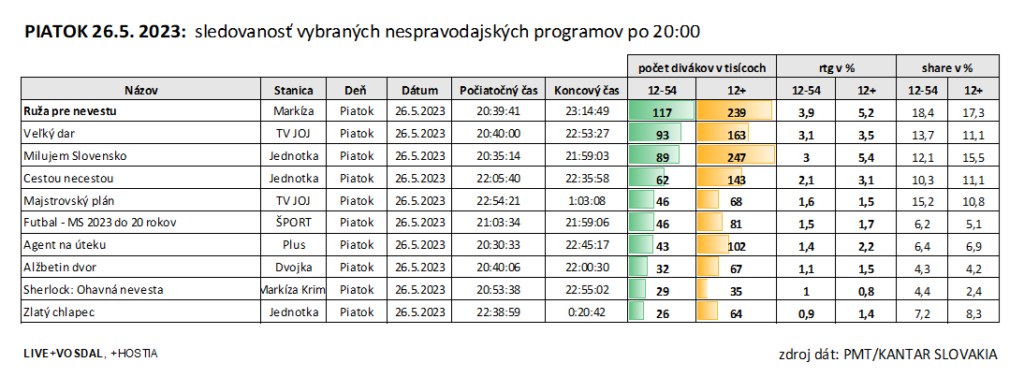 V piatok večer vyhrala Ruža pre nevestu v komerčnej a Milujem Slovensko v univerzálnej cieľovke