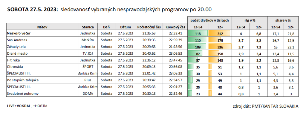 Jediný program, ktorý sa Záhadám tela dokázal v sobotu priblížiť, bola relácia Neskoro večer, ktorá s ratingom 6,8 percenta (312-tisíc divákov) uzatvárala prime time ťaženie ako silná dvojka večera i celého dňa.