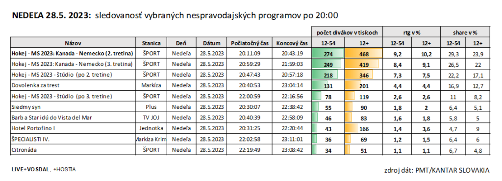 Finálový zápas majstrovstiev sveta v hokeji bol mimoriadnou športovou udalosťou a aj z pohľadu sledovanosti si u divákov Športu pripísal veľmi slušný výsledok. Duel medzi Kanadou a Nemeckom dominoval v oboch kľúčových cieľovkách ako suverénne najsledovanejší program dňa.