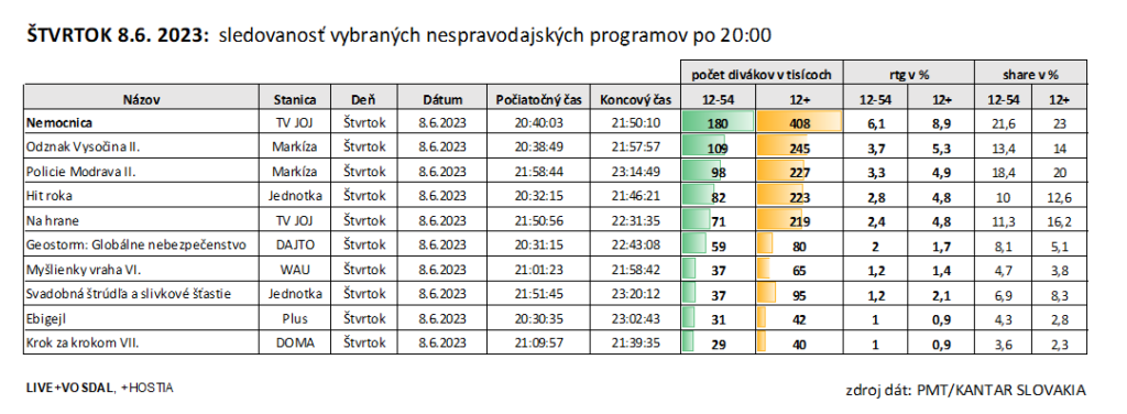 Napriek silnej nadvláde skupiny Markíza večer v oboch kľúčových cieľových skupinách jasne dominoval jojkársky seriál Nemocnica. V komerčnej cieľovej skupine 12 – 54 dosiahol rating na úrovni 6,1 percenta a podiel na trhu 21,6 percenta.