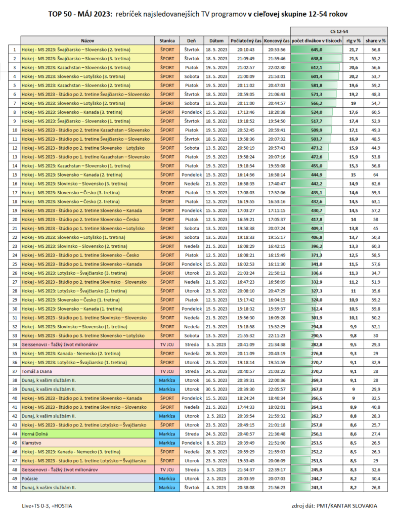 Prvý nehokejový program skončil až na 34. priečke. Vybojovala si ju reality show Geissenovci - Ťažký život milionárov, ktorú na Jojke sledovalo 282 800 divákov. Geissenovci figurujú v tomto rebríčku dokonca dvakrát. Ďalšími formátmi májovej TOP 50 sú jojkársky seriál Tomáš a Diana (270 200 divákov). Markizácky účet otvára seriál Dunaj, k vašim službám II. (269 300 divákov), ktorý figuruje v rebríčku štyrikrát, potom spomienková Horná Dolná (256 100 divákov), seriál Klamstvo (253 500 divákov) a Počasie (244 700 divákov).