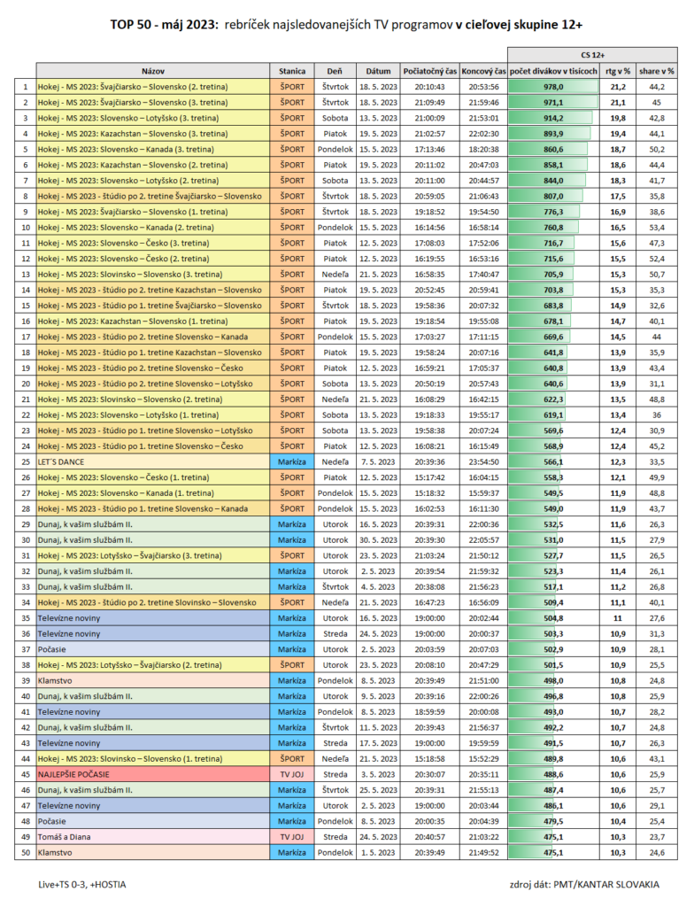 V komerčnej cieľovej skupine 12-54 obsadil v májovom rebríčku TOP 50 najsledovanejších televíznych programov hokej na Športe až 40 priečok. Z toho 23 patrilo jednotlivým hokejovým tretinám a 17 priečok si zarezervovali štúdiá s hokejovými expertmi Mariánom Gáboríkom a Borisom Valábikom. TV Markíze sa podarilo získať sedem zápisov a TV JOJ si vybojovala tri.