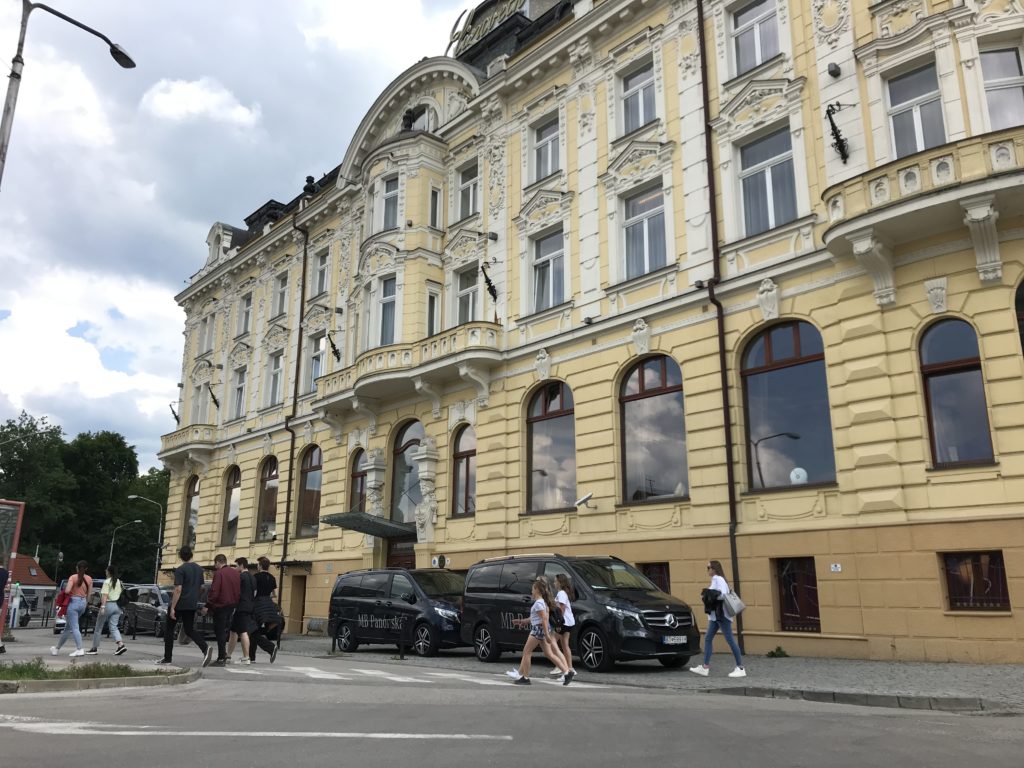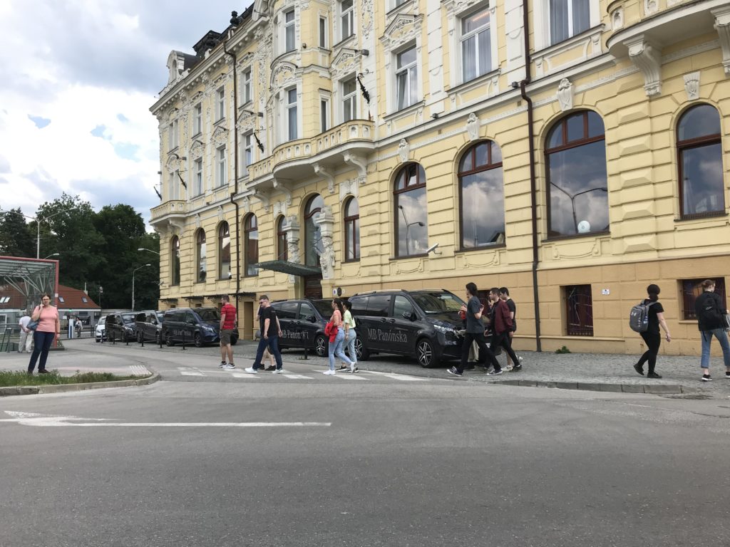 Členovia kapely Rammstein trávia popoludnie v legendárnom trenčianskom Hoteli Elizabeth. Pred vchodom sú zaparkované autá, ktoré ich odvezú na večerný koncert.