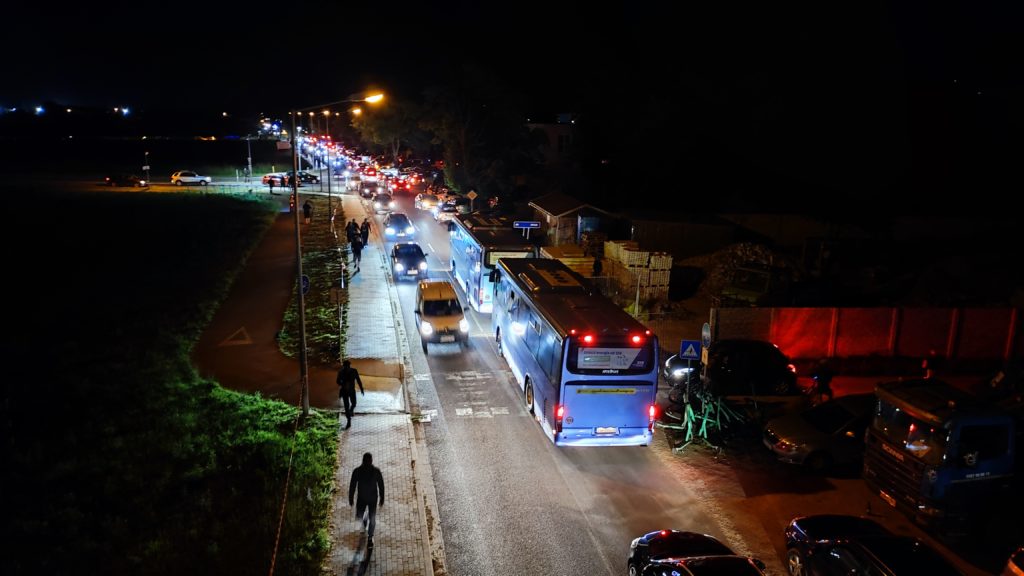 Na železničnej stanici vystúpili ďalší fanúšikovia. Pripravené autobusy kyvadlovej dopravy na letisko sú beznádejne zaplnené.