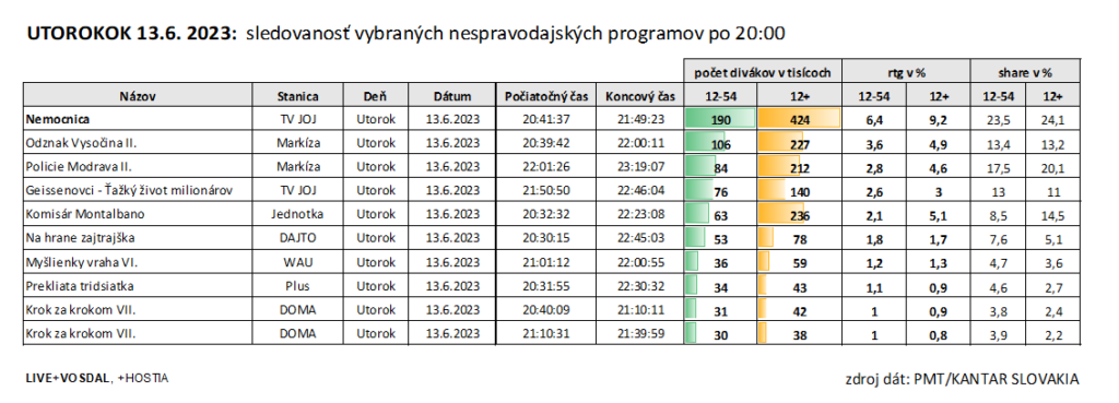 V cieľovke 12 – 54 si zopakovala sledovanosť spred týždňa. Dosiahla rating na úrovni 6,4 percenta a podiel na trhu 23,5 percenta. V univerzálnej cieľovke si Nemocnicu pozrelo na Jojke 424-tisíc divákov.
