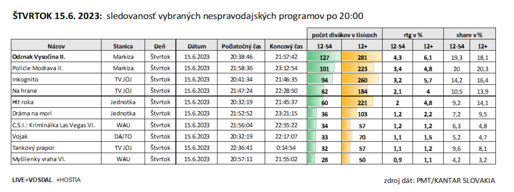 Aj v univerzálnej cieľovke si Odznak Vysočina II. pripísal víťazstvo večera. Markizácky seriál si pozrelo 281-tisíc divákov, nasledovalo Inkognito s 260-tisíc divákmi a na treťom mieste skončil s 223-tisíc divákmi seriál Policie Modrava II.