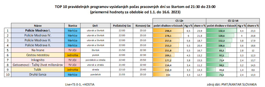 Jednotlivé série seriálu Policie Modrava dominovali tento rok na obrazovkách po dvadsiatej druhej hodine aj v univerzálnej cieľovke. A dokonca v tom istom poradí ako v tej komerčnej. Jednotkou tohto časového pásma bola reprízová Policie Modrava I., ktorú v priemere sledovalo viac ako 298-tisíc divákov a najsledovanejšiu časť videlo na Markíze 324-tisíc divákov. Druhá pozícia v cieľovke 12+ patrí premiérovej sérii Policie Modrava IV., ktorú pravidelne pozeralo viac ako 278-tisíc divákov a najsledovanejší diel videlo 313-tisíc divákov. Tretia priečka patrí premiérovej Policie Modrava III. s diváckym priemerom takmer 258-tisíc divákov, pričom tú najsledovanejšiu časť si na Markíze pozrelo 286-tisíc divákov.