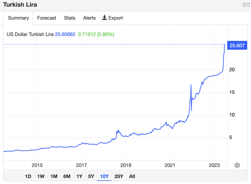 Neochotu tureckého štátneho monopolu a tamojšej vládnej triedy obmedziť využívanie zlých peňazí k vlastnému financovaniu viedlo k postupnému znehodnoteniu tureckej líry aj voči iným zlým peniazom. Voči americkému doláru turecká líra stratila za ostatných desať rokov 92 percent hodnoty. Pritom aj samotný dolár nepretržite krváca výmennú hodnotu oproti veciam, ktoré sa tak ľahko štátom tlačiť nedajú.