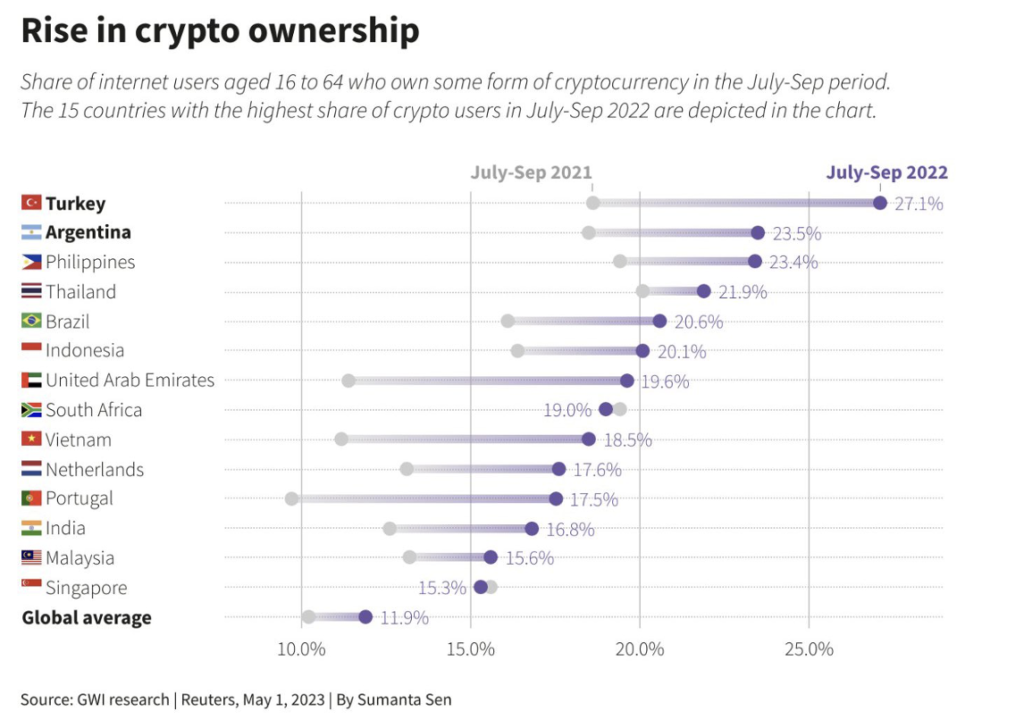 Nie sa čo čudovať, že Turci uväznení v extrémne zlých monopolných peniazoch hľadajú alternatívy. Jednou z nich je bitcoin. Za jediný rok 2021/2022 tam podiel používateľov internetu v krajine vo veku 16 až 64 rokov, ktorí vlastnili kryptomenu, vzrástol z 18 na 27 percent.