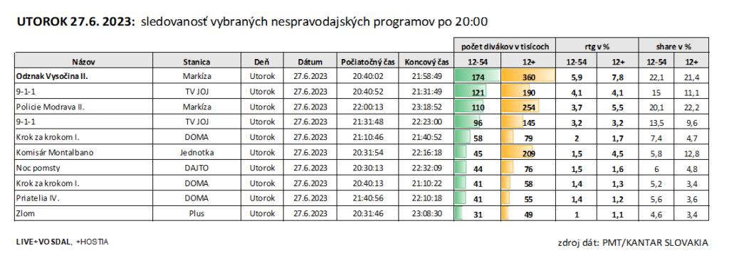 V univerzálnej cieľovej skupine Odznak Vysočina II. potvrdil pozíciu najsilnejšieho programu večera. Markizácky seriál si pripísal rekordných 360-tisíc divákov a doteraz najlepší výkon tak vylepšil o takmer 80-tisíc divákov. Reprízová Policie Modrava II. uzatvárala večer ako dvojka večera so sériovým maximom v podobe 254-tisíc divákov, pred talianskym krimiseriálom Komisár Montalbano s 209-tisíc divákmi.