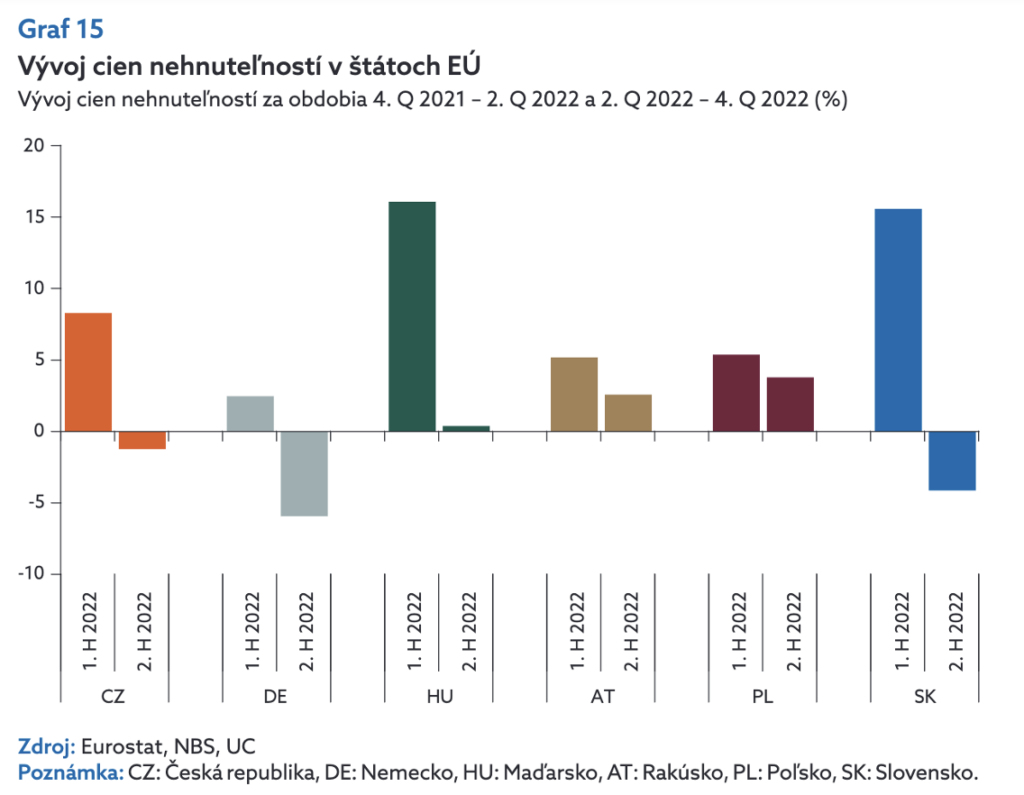 „Kým na jar 2022 bolo v každom mesiaci (na Slovensku) predaných 78 až 86 percent ponúkaných bytov, v prvom štvrťroku 2023 to bolo už len medzi 64 a 70 percentami. Už v lete roku 2022 začali klesať ceny hlavne starších bytov v Bratislave, pričom odvtedy zaznamenali pokles o viac než 10 percent. Negatívny sentiment na trhu zasiahol aj bratislavské novostavby. Prudký prepad predaja novostavieb je evidentný už od leta roku 2022 a pokračoval aj počas prvých troch mesiacov roka 2023.“ píše ďalej NBS.
