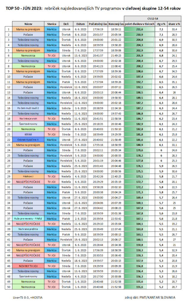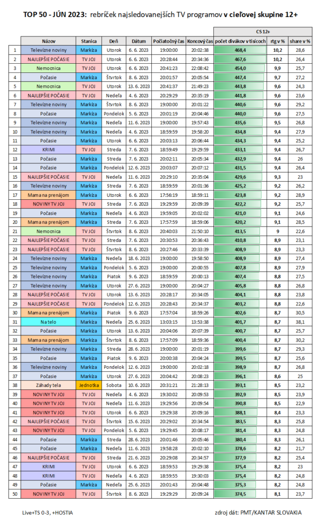Aj v cieľovke 12+ bolo poradie na prvých dvoch miestach mimoriadne vyrovnané a opäť rozhodli len stovky divákov. Najsledovanejším júnovým programom sa tak stali markizácke Televízne noviny so 468 400 divákmi, tesne pred jojkárskym NAJLEPŠÍM POČASÍM, ktoré sledovalo 467 600 divákov. Nasleduje Nemocnica so 454-tisíc a Počasie so 447 400 divákmi.