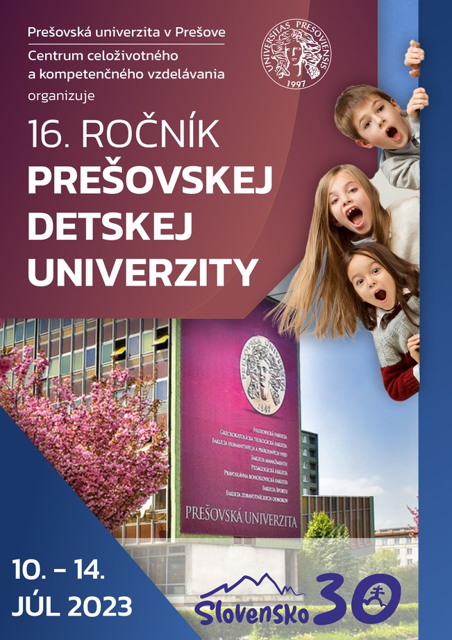 Na krátkych prednáškach sa deti dozvedia informácie o slovenskom športe, zdravom životnom štýle, slovenskom folklóre či novodobých slovenských dejinách. „Magisterčekovia sa zúčastnia fantazijnej cesty od západu po východ Slovenska. Absolvujú slovný duel mapujúci ich vedomosti o Slovensku, skúsia si pripraviť vlastnú reportáž, a tiež kultúrne vystúpenie súvisiace s ľudovými tradíciami. Objavovať Slovensko a jeho osobnosti histórie môžu tiež v knižnici univerzity,“ ozrejmila program žiakov 5. až 9. ročníka základných škôl riaditeľka Ústavu pedagogiky, andragogiky a psychológie Fakulty humanitných a prírodných vied PU Lenka Pasternáková. Okrem návštevy Krajského múzea v Prešove bude zaujímavosťou 16. ročníka detskej univerzity aj prehliadka Mestského úradu v Prešove, kde sa deti dozvedia o jeho fungovaní a zoznámia sa s dejinami mesta Prešov.