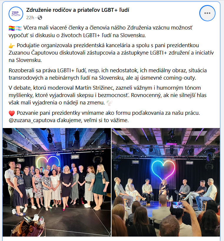 "S doznievajúcimi skvelými dojmami z festivalu Pohoda bola reč o tom, kedy bude Slovensko 'pohodovou' krajinou aj pre LGBTI+ ľudí. Rozoberali sa o coming-outy či zmeny názoru na LGBTI+ ľudí, prijatie v menších mestách a v neposlednom rade postavenie transrodových a nebinárnych ľudí," informovalo združenie na sociálnej sieti.