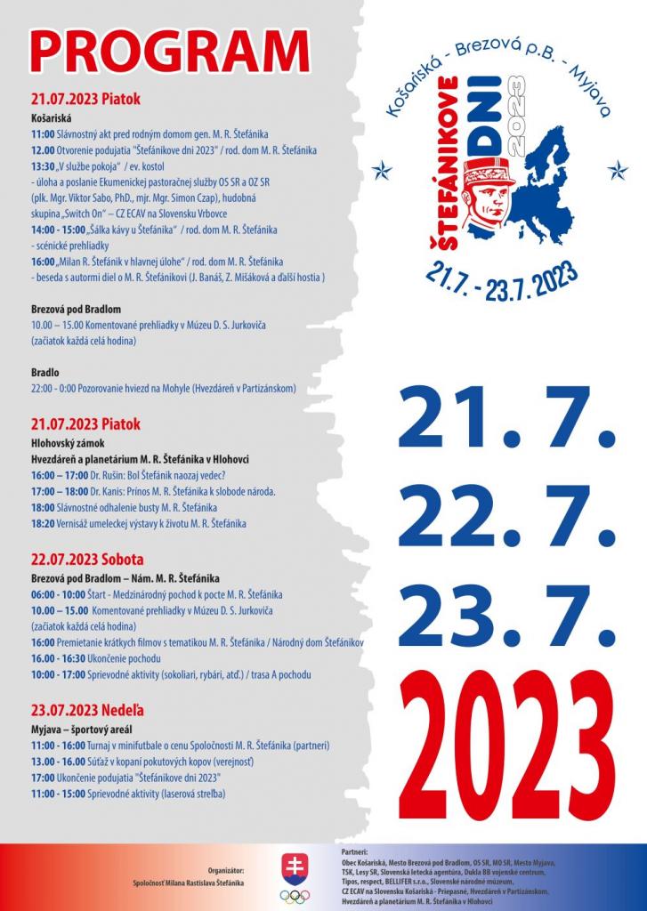 Kompletný program Štefánikových dní v Košariskách, Brezovej pod Bradlom, na Bradle, v Myjave a v Hlohovci si môžete naštudovať na priloženom plagáte.