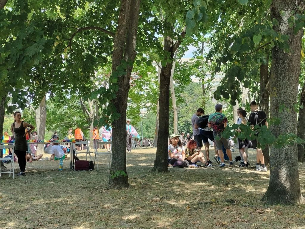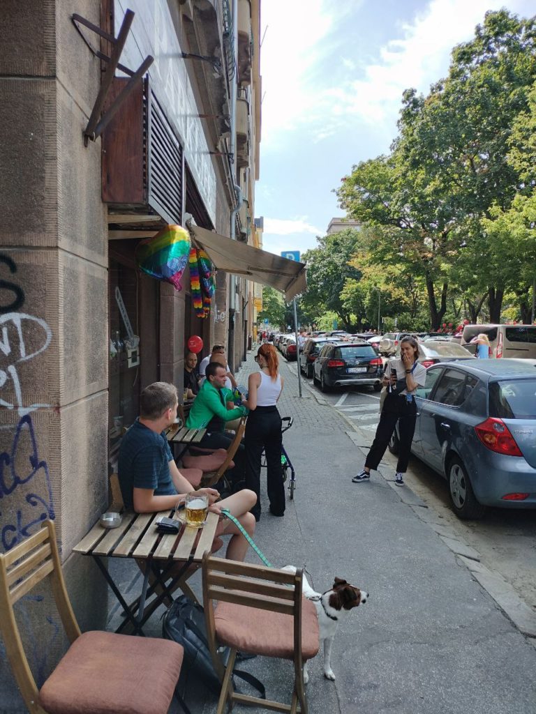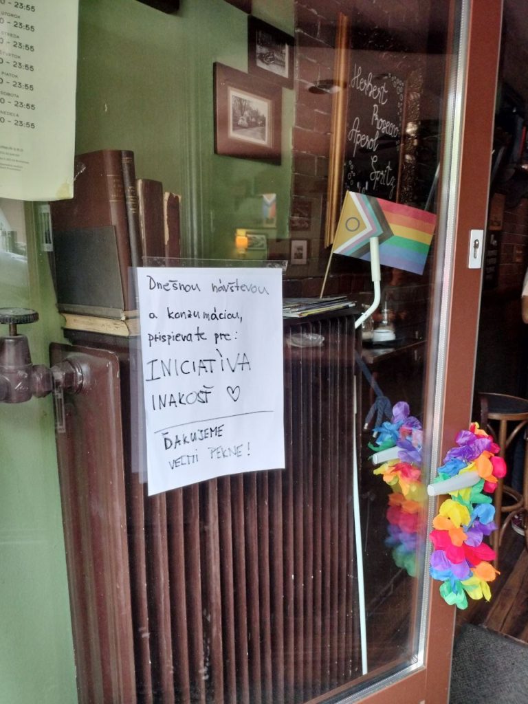O niekoľko metrov cez cestu stojí pri parku malá kaviareň s vonkajším sedením, ktorú jej prevádzkar pre ten deň ozdobil dúhovými motívmi. Na dvere tiež zvonku vyvesil oznam, že časť tržieb poputuje Iniciatíve Inakosť a sám si obliekol tričko s dúhou. Na moju otázku o dôvodoch odpovedal, že podobnú výzdobu má v kaviarni každý rok počas Dúhového Pridu. Nešlo teda podľa jeho slov o reakciu na Hrdí na rodinu.