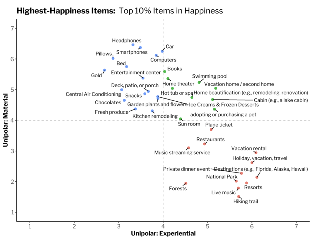 V štúdii, samozrejme, zistili, že aj materiálne veci robia ľudí šťastnejšími. Prečo by ich inak ľudia kupovali? Zaujímavé sú však konkrétnosti. Tu je výber položiek, ktorých nákup priniesol ľuďom najviac šťastia (top 10 percent z možností v štúdii): z čisto materiálneho hľadiska (modré body), zo zážitkového hľadiska (červené) a ich kombináciou (zelené).