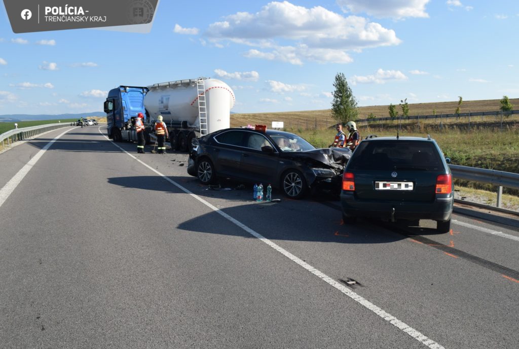 „Následne 36-ročný vodič narazil do prednej časti ďalšieho motorového vozidla Volkswagen Passat, ktoré jazdilo za jazdnou súpravou vozidla. Pri dopravnej nehode došlo aj k poškodeniu zvodidiel," informovala Polícia SR - Trenčiansky kraj na svojom facebooku.