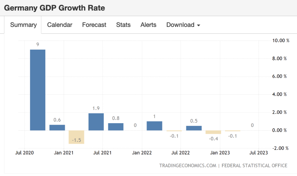 DE-growth pokračuje. Nemecký hrubý domáci produkt nerástol oproti predchádzajúcemu štvrťroku ani v druhom štvrťroku 2023. Nemecko tak už je v recesii.