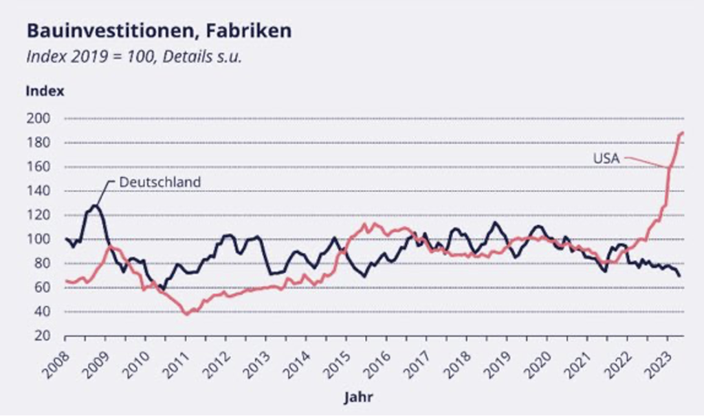 Rozdiel oproti USA, kde investíciám pomohli aj 891-miliárddolárový The Inflation Reduction Act of 2022, je zásadný. V USA sa stavajú nové fabriky, v Nemecku sa fabriky zatvárajú a sťahujú do iných krajín.