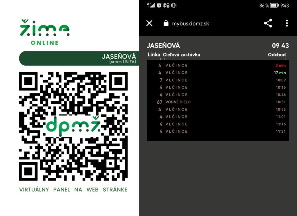 Cestujúci mestskou hromadnou dopravou už nemusia manuálne vyhľadávať spoje, pomôcť im má novinka na zastávkach MHD. Každá zastávka v Žiline má svoj QR kód, ktorý funguje ako virtuálny panel, a teda reálne časy odchodu spojov sa zobrazia vo webovom prehliadači.