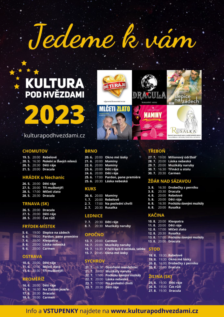 Spolu 16 zastávok v českých mestách dopĺňajú premiéry na Slovensku – v Trnave, kde vystúpili v máji, a v spomínanej Žiline. Podujatie Kultúra pod hviezdami prináša rôzne predstavenia ako tradičné Děti ráje, Draculu, Rebely, ale aj muzikálové novinky Maminy, Okno mé lásky, operu Rusalka a mnoho ďalších titulov.