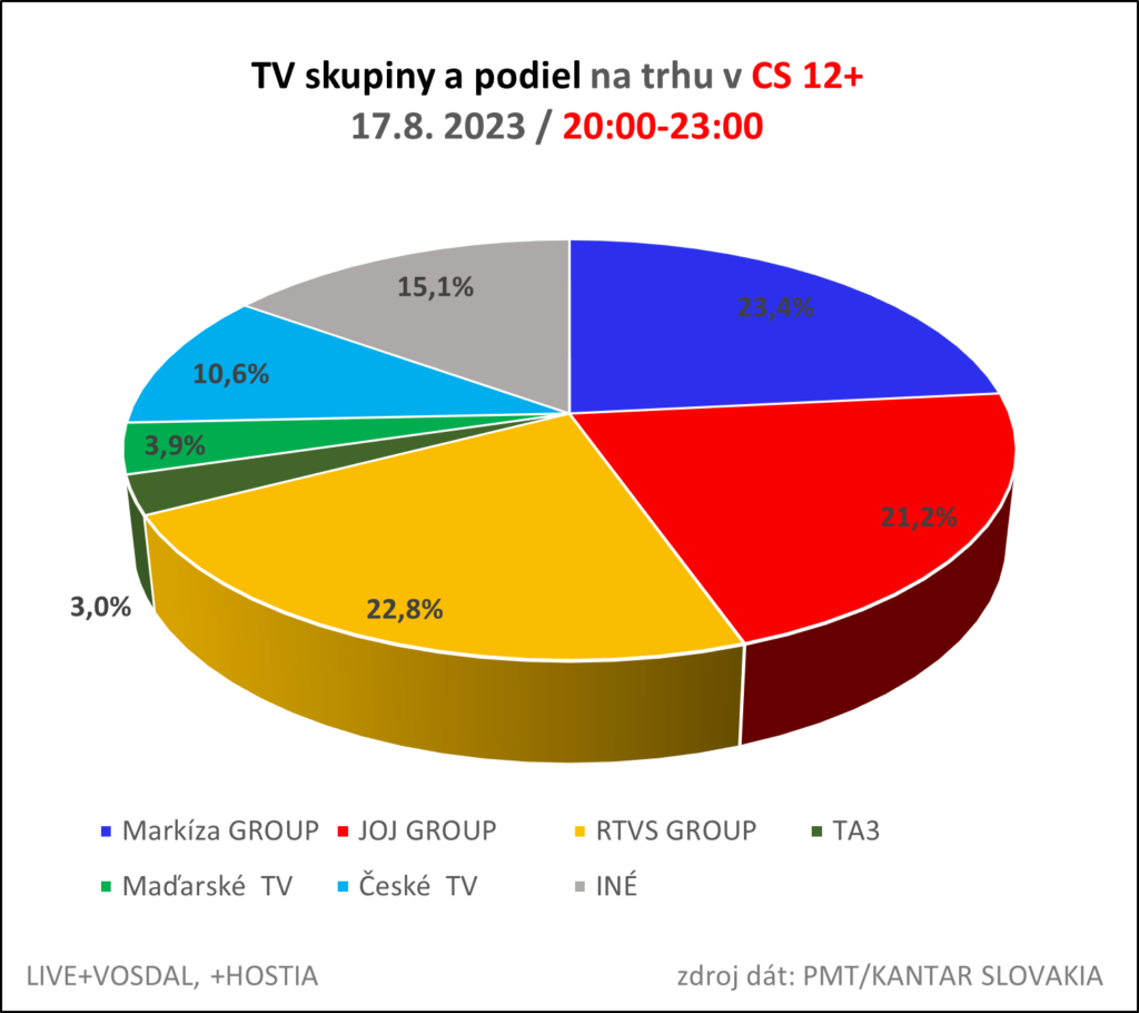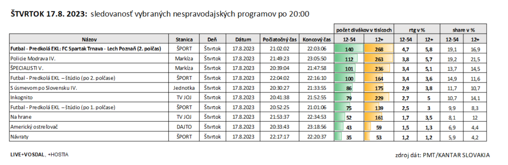 V univerzálnej cieľovej skupine sa poradie na prvých troch priečkach nemenilo. Najviac divákov prilákal druhý polčas zápasu FC Spartak Trnava - Lech Poznaň, ktorý na Športe videlo 268-tisíc divákov. V tesnom závese nasledoval krimiseriál Policie Modrava IV., ktorý na Markíze sledovalo 263-tisíc divákov a trojkou večera boli markizácki Špecialisti V. s 236-tisíc divákmi. Dôvod na spokojnosť má po štvrtku aj spravodajská televízia TA3, ktorá si s celodenným podielom 4,1 percenta v cieľovke 12+ pripísala druhý najlepší tohoročný výsledok.